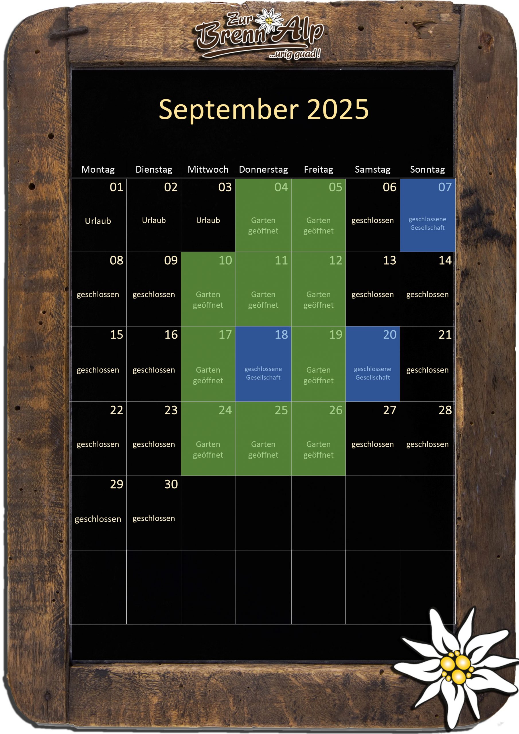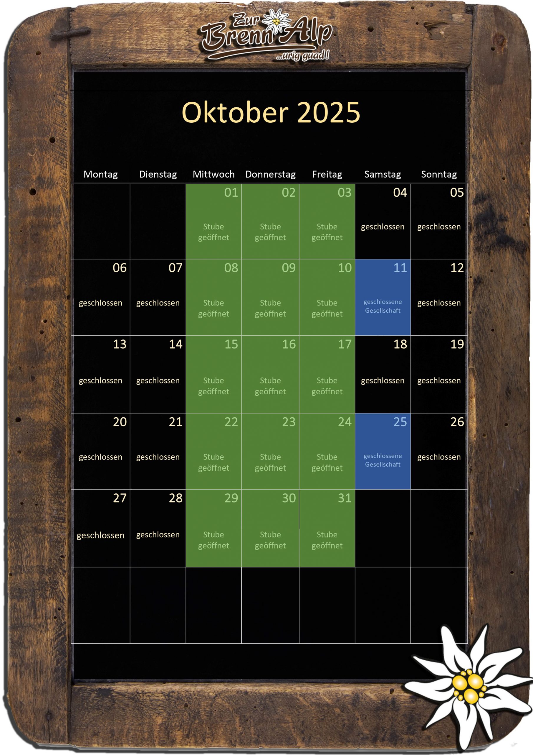 wir heißen Euch mittwochs, donnerstags und freitags von 17.00 – 22.00 Uhr in unserer gemütlichen BrennAlp-Stube herzlich willkommen!