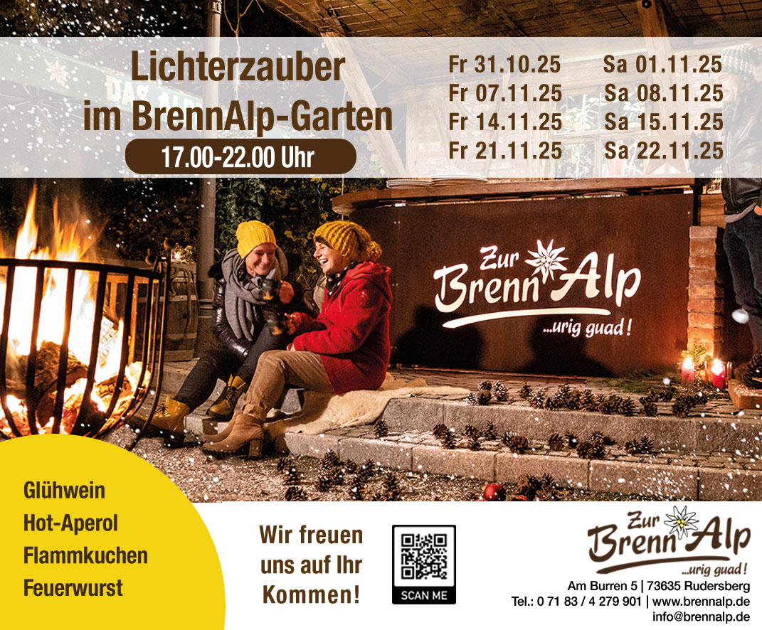 Ab 31. Oktober 2025 haben wir unseren funkelnden BrennAlp-Garten jedes Wochenende für euch geöffnet, bis wir am 28. November 2025 wieder in unsere Hütten im Adventswald einziehen und euch dort mit unseren Spezialitäten verwöhnen.