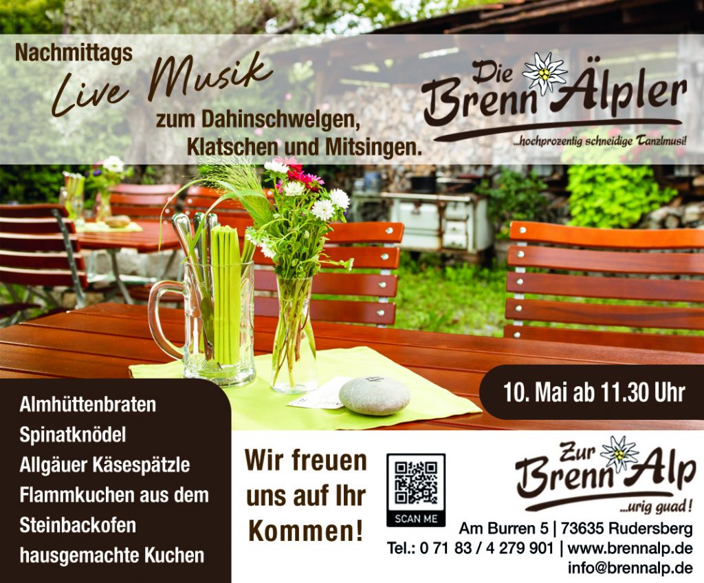 wir laden Euch am 10. Mai 2026 ganz herzlich in den BrennAlp-Garten ein. Gemütliches Verweilen bei leckerem Gaumenschmaus und launiger live-Musik von den BrennÄlplern.